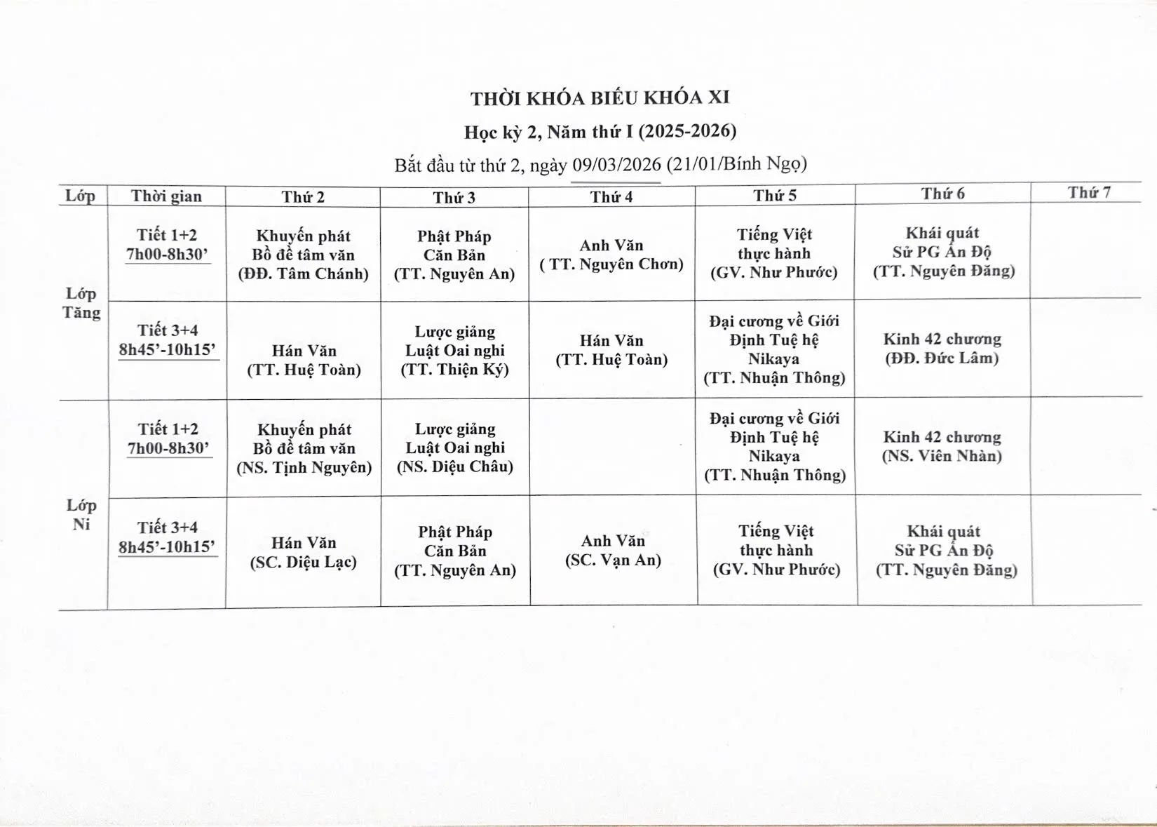 THỜI KHÓA BIỂU HỌC KỲ 2 - NĂM THỨ NHẤT(2025-2026)- KHÓA XI